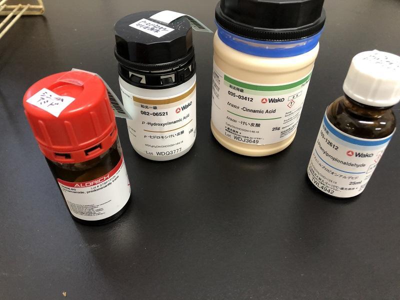 試薬12種類(ケイヒ酸エチル、3‐フェニルプロピオンアルデヒド、シンナムアミドなど)を用いてシンナムアルデヒドの構造に類似した物質から抗菌作用に相関のある部位を探っている。