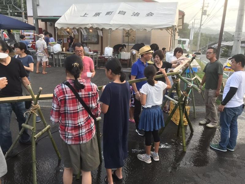 お祭り用の「灯篭の橋」づくりで竹に穴をあけているところ