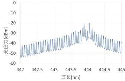 ■写真②:3/13-3/14、440nmを出力する半導体レーザの静電流における波長-光出力特性を測定。(28mA、20℃)静電流の大きさを変え、同様に測定を行った。