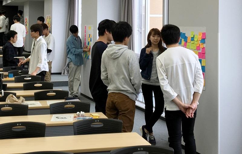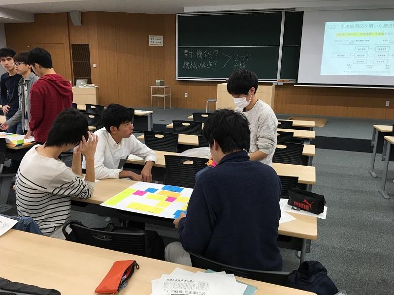 最初の課題は身近にある製品を1つ採用して、少人数グループに分かれて思考展開図を構成してみることから始めます。要求機能や機構、構造を関連付けて提示するもので、設計の上流における枠組です。身近にある製品としたのは、機械工学の立場から設計を考えるだけでなく同時に学生自身がそれらの使用を経験するユーザでもあることから、思考展開の枠組みをイメージしやすく主体的に学べる目的で設定しました。学生は、普段使用している機器であっても、いざ設計の要求機能にあたる種を出そうとすると、苦労している様子が伺えます。日常の様々な物事に、いかに無意識でいたのかを気づく様子がわかります。