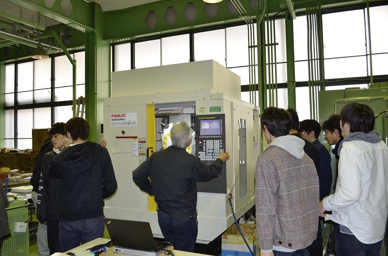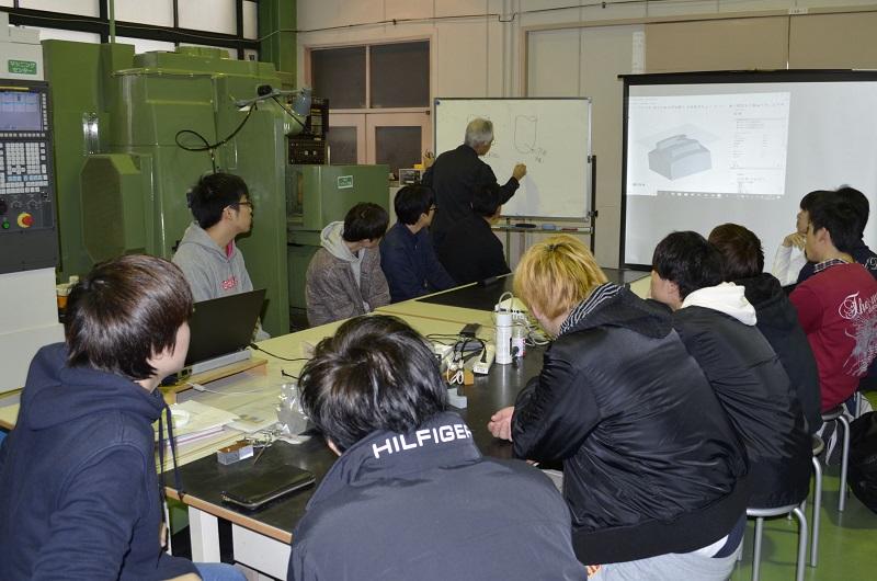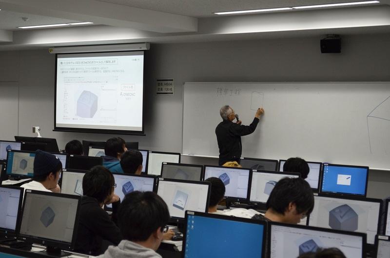 本プログラムは、設計から生産を考えていく流れについて少しでも体得できることを目的に、講義開始を目指して一昨年度より準備を進めてきました。本年度より機械工学科2年生において実際に講義がスタートしました。設計から生産加工にわたる過程、すなわち設計の出口の領域にあたります。設計分野で普及している3DCAD(3次元コンピュータ援用設計)による設計と、CAM(コンピュータ支援による製造)によるNC加工データの作成、そしてNC工作機械(数値制御による工作機械)を用いて、加工まで設計データの一貫性を通した横断型の教育を図るものです。設計し図面化された“考え”(仮想の姿)を、座学で学修した生産加工の知識と技術を応用してどのような過程によって具現化するのかを、学生が体験学修を通して理解していきます。設計データという仮想の姿が、実際にNC工作機械で実体として産まれてくるのを実感している様子がわかります。