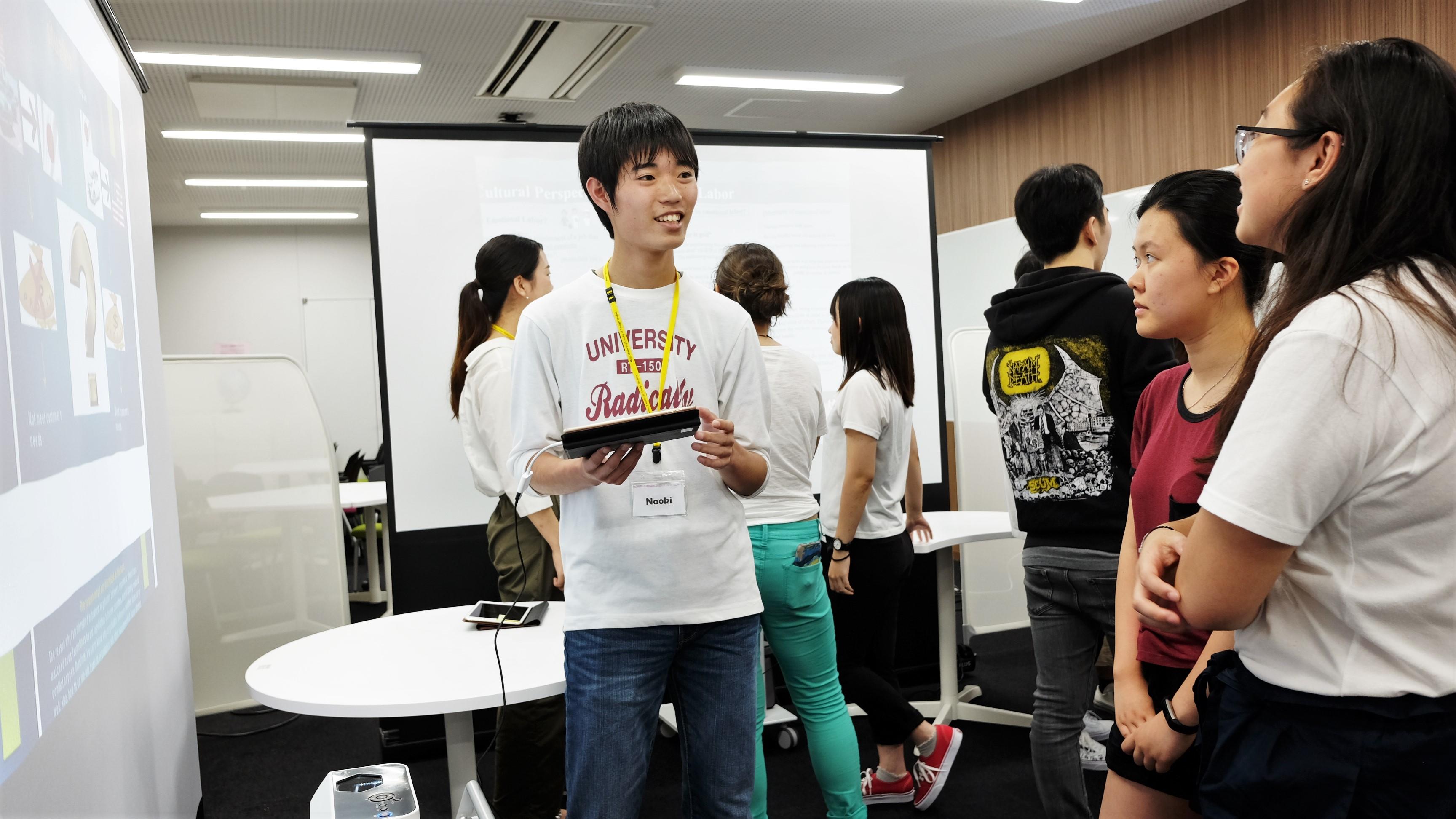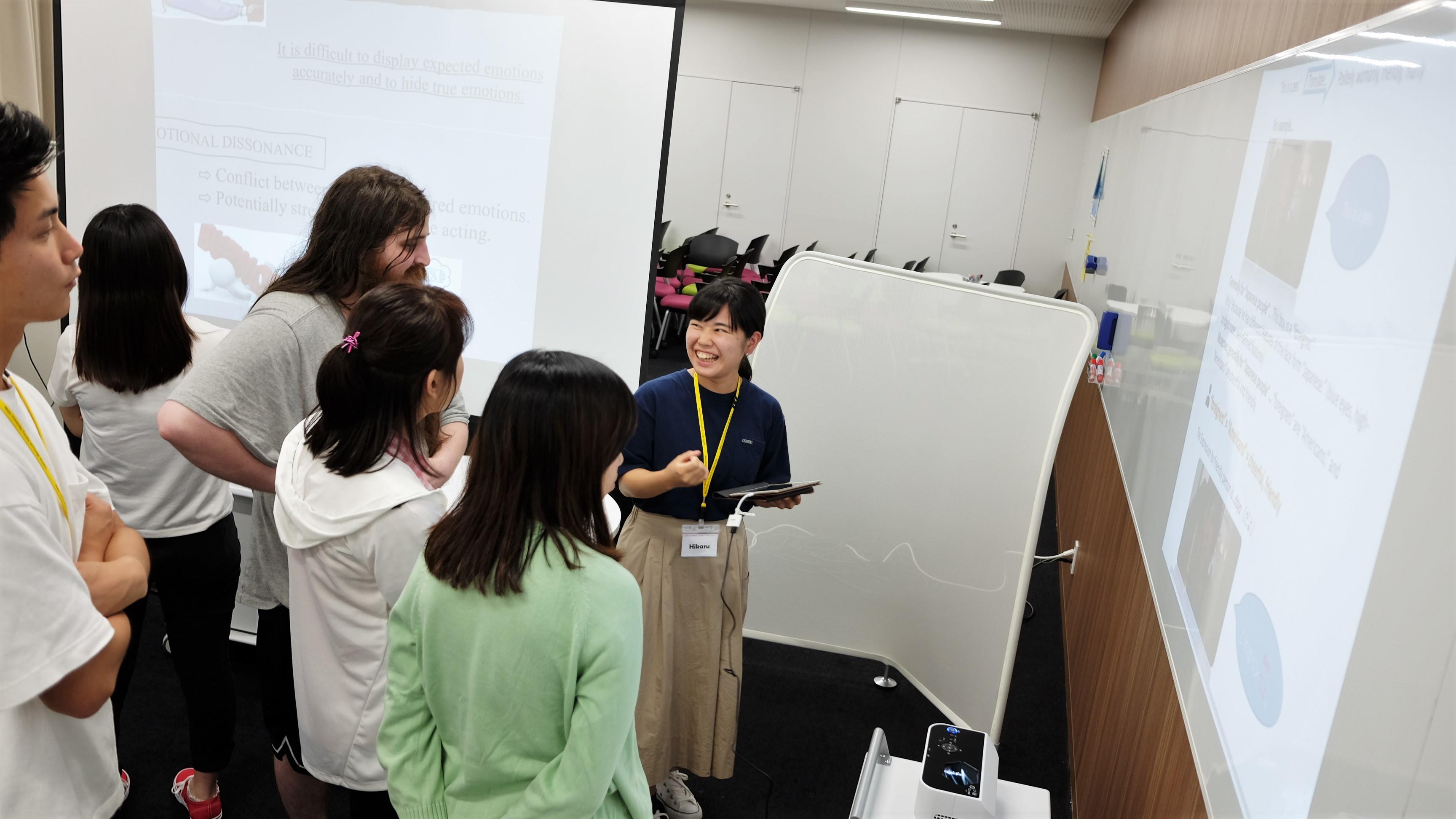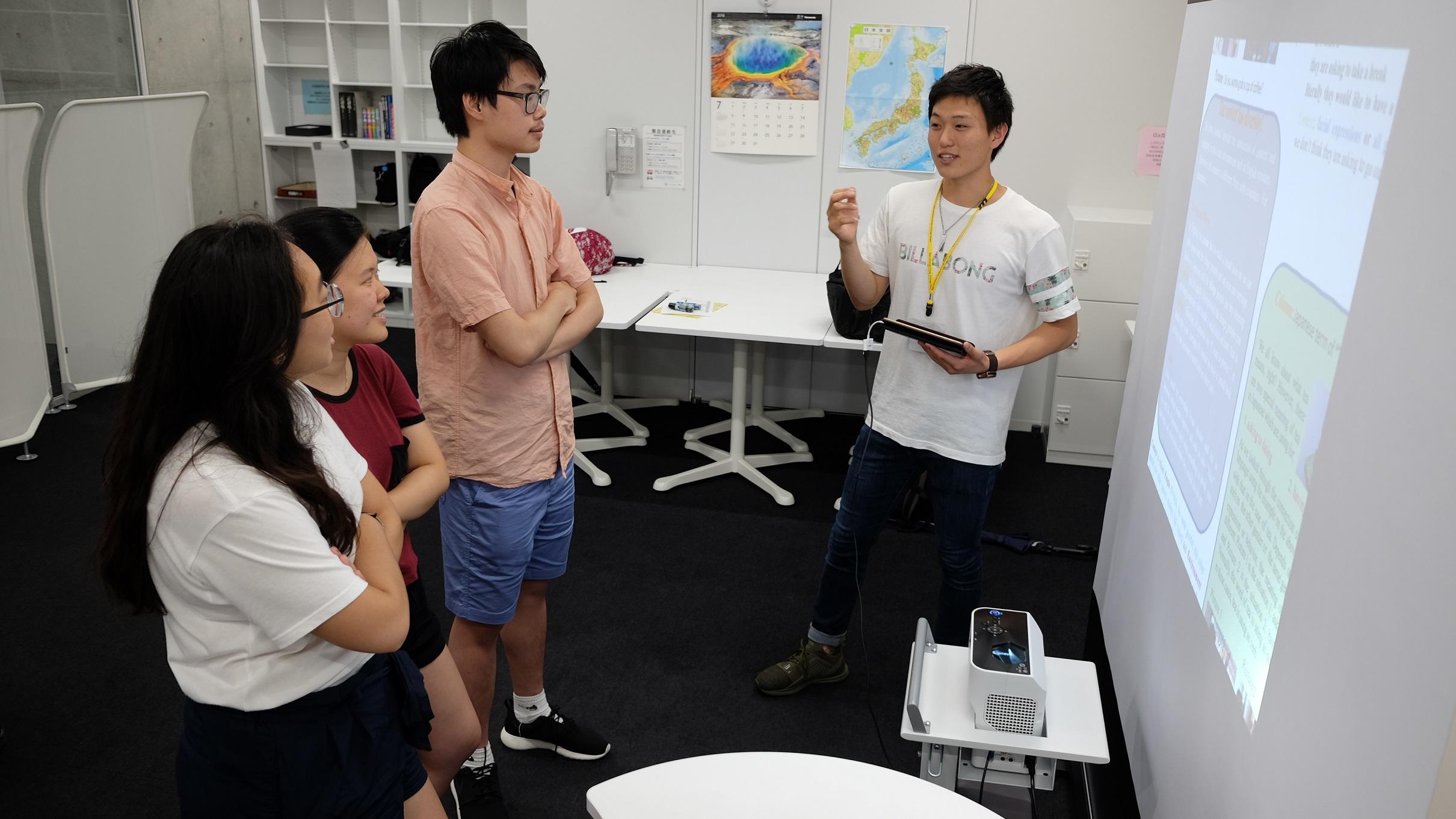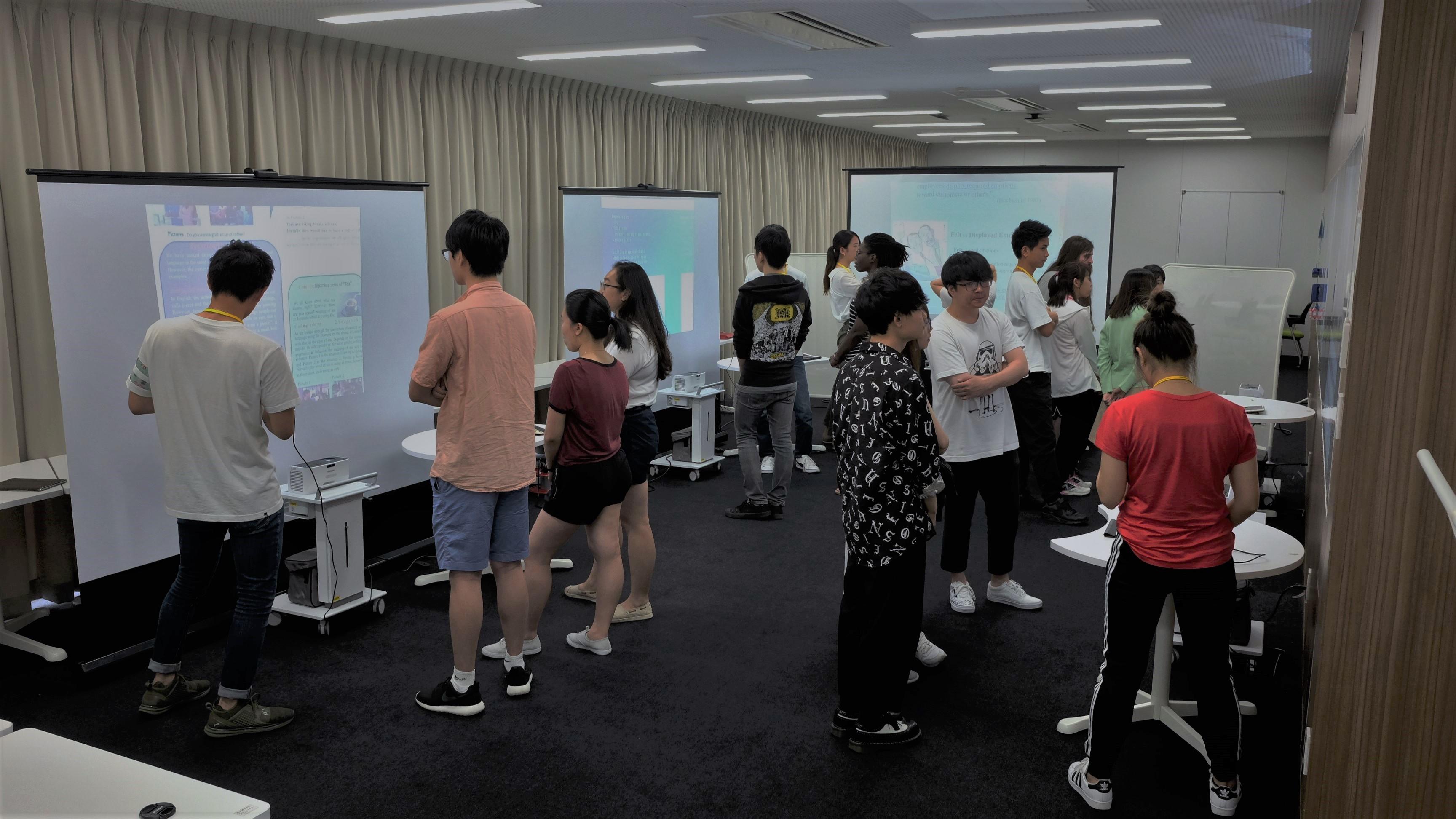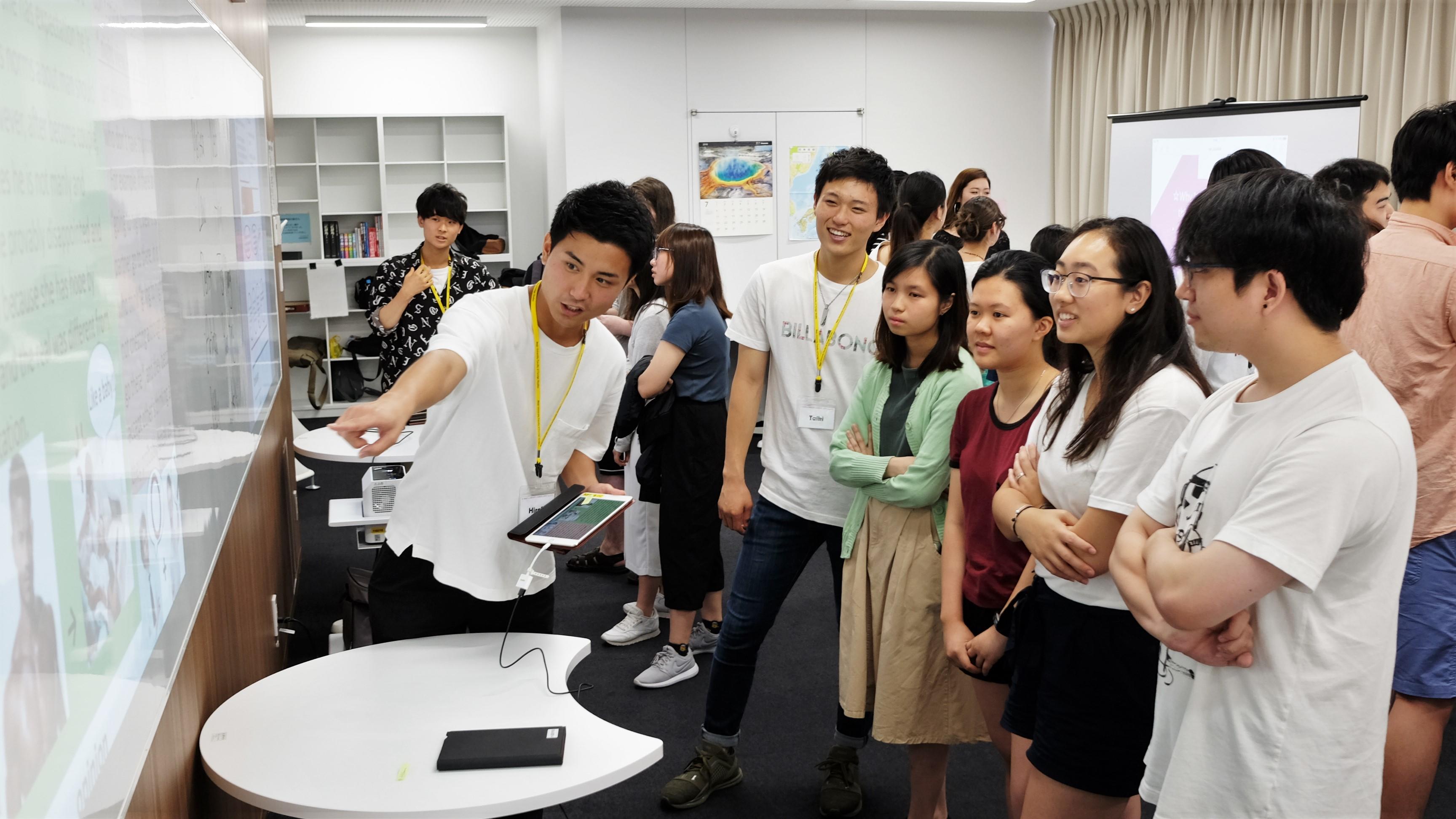 すでにタブレットの教育的活用が盛んに行われている外国語学部で、その活用をさらに推し進めるために、今年度は短焦点プロジェクターを導入し、従来の印刷/紙ベースではない、タブレットによる「ICTポスター発表」を行いました。本学部では第一期生となるゼミ生(宮崎ゼミ)10名が、それぞれの研究テーマをポスター形式にまとめ、その成果をMeijo Summer School 2018に参加した留学生11名に対して英語で発表しました。発表箇所や強調したい内容に合わせて画像を移動・拡大しながら発表をするという、従来のポスター発表ではできなかった「議論の見せ方」を通じて、インタラクティブで活発な議論を留学生と行うことが出来ました。 (授業担当者:宮崎新)