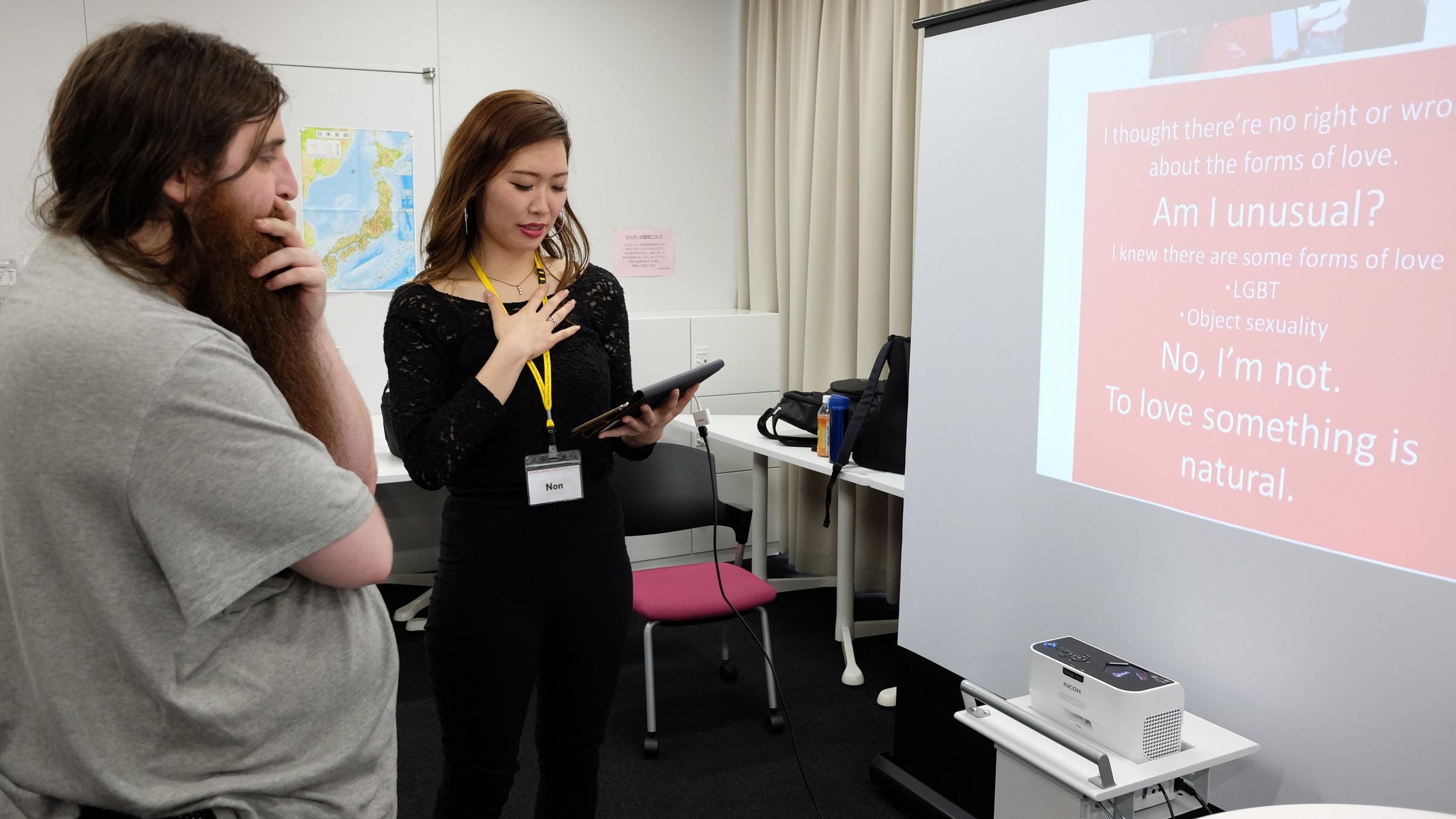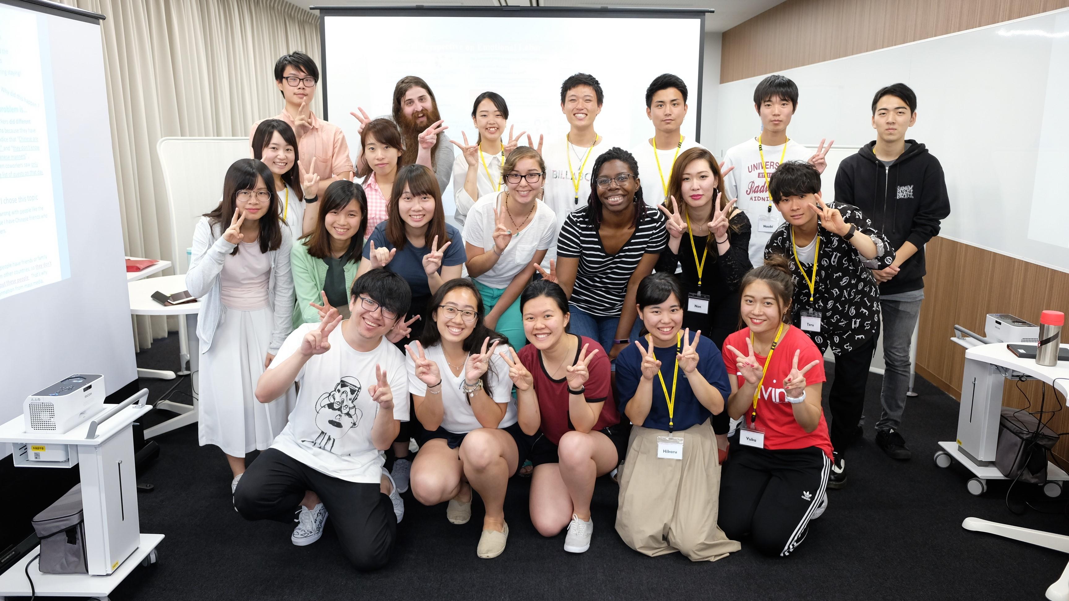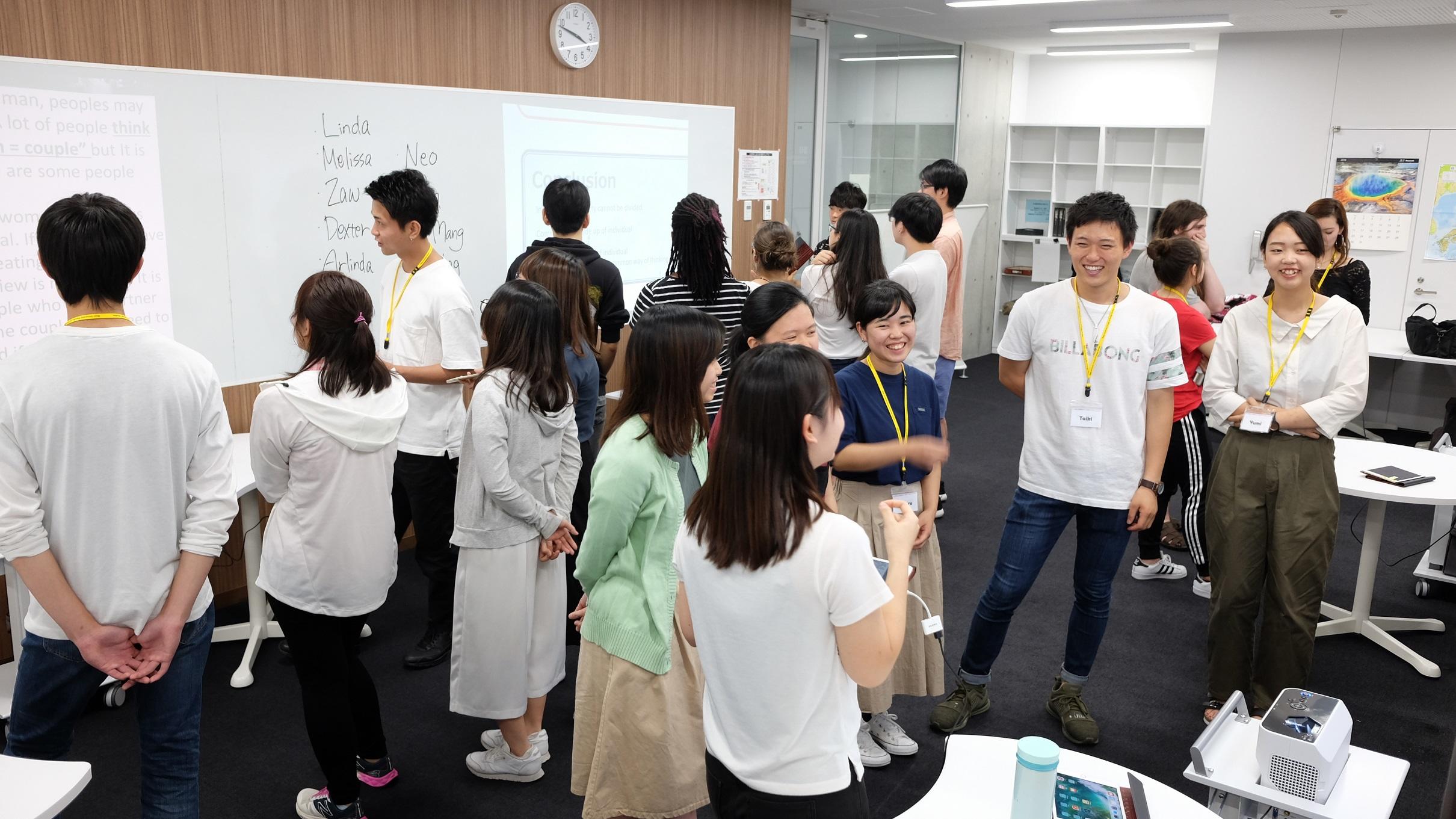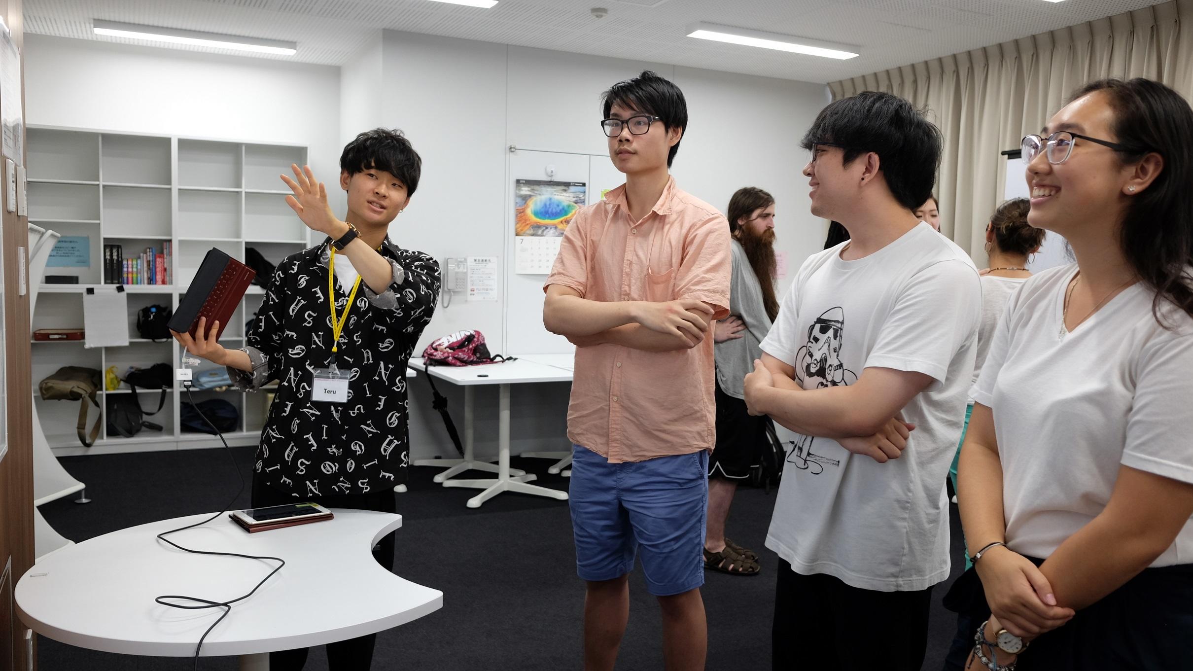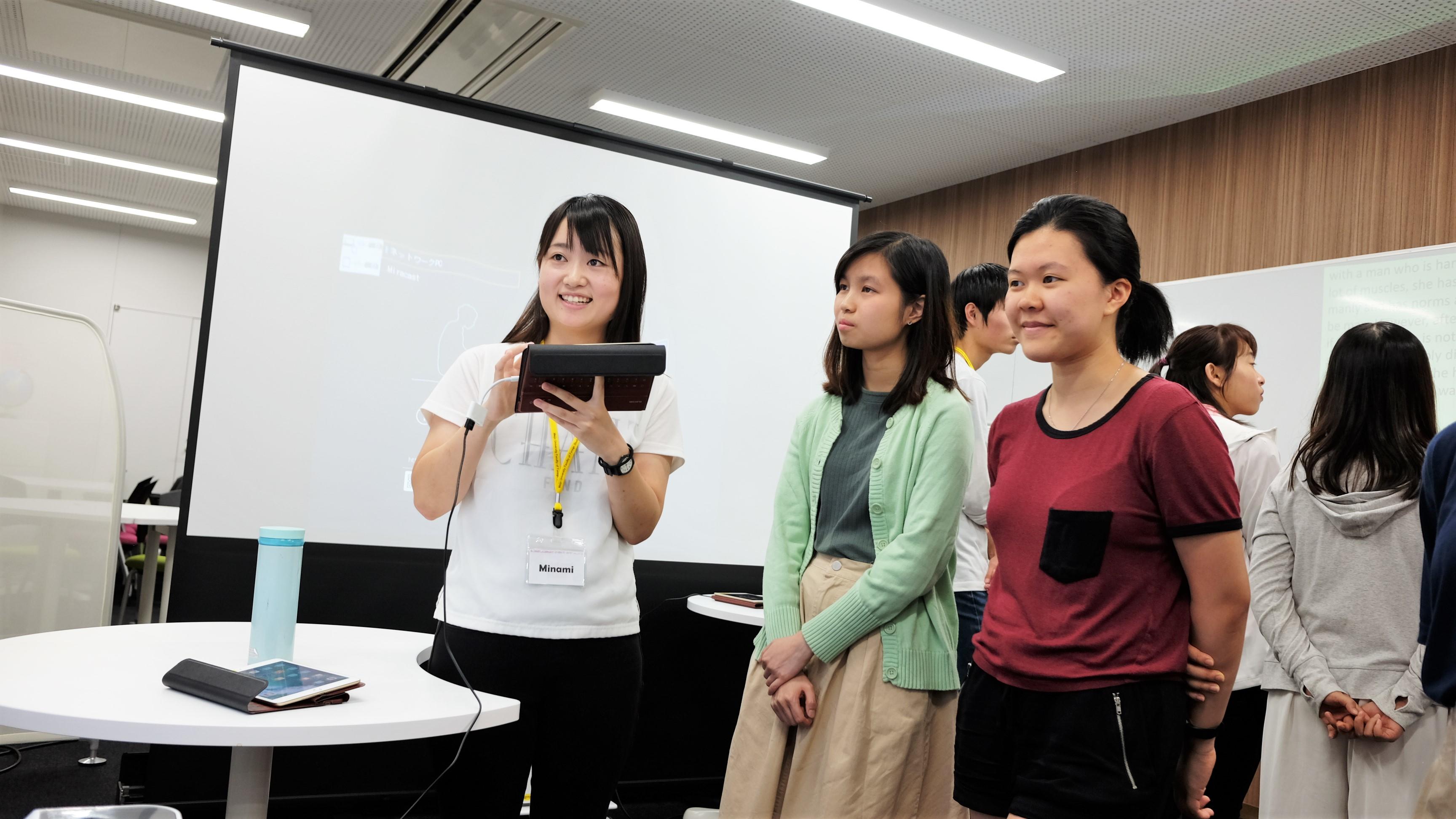 すでにタブレットの教育的活用が盛んに行われている外国語学部で、その活用をさらに推し進めるために、今年度は短焦点プロジェクターを導入し、従来の印刷/紙ベースではない、タブレットによる「ICTポスター発表」を行いました。本学部では第一期生となるゼミ生(宮崎ゼミ)10名が、それぞれの研究テーマをポスター形式にまとめ、その成果をMeijo Summer School 2018に参加した留学生11名に対して英語で発表しました。発表箇所や強調したい内容に合わせて画像を移動・拡大しながら発表をするという、従来のポスター発表ではできなかった「議論の見せ方」を通じて、インタラクティブで活発な議論を留学生と行うことが出来ました。 (授業担当者:宮崎新)