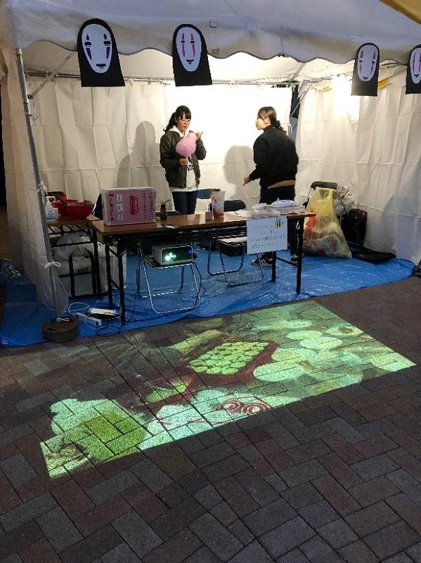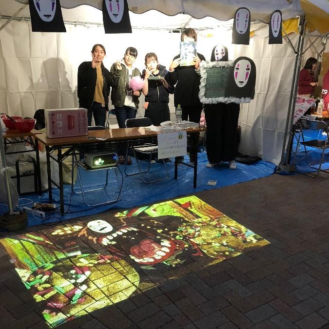 先に行われた(2018年11月3、4日)にかけて行われた大学祭で、ベビーカステラを出展することになった柳沢准教授が担当する基礎演習IIの学生たちは、商品を売り込む手段として、苦労した商品開発の過程やアニメに因んだ出展コンセプトをスライド化して地面に投影させました。タブレット端末と可動式プロジェクターが実現したこのプロジェクションマッピングを通して、商品の販売促進にどれほどの効果を持つかにいて学生たちは学びました。