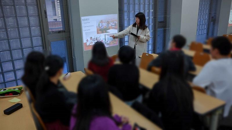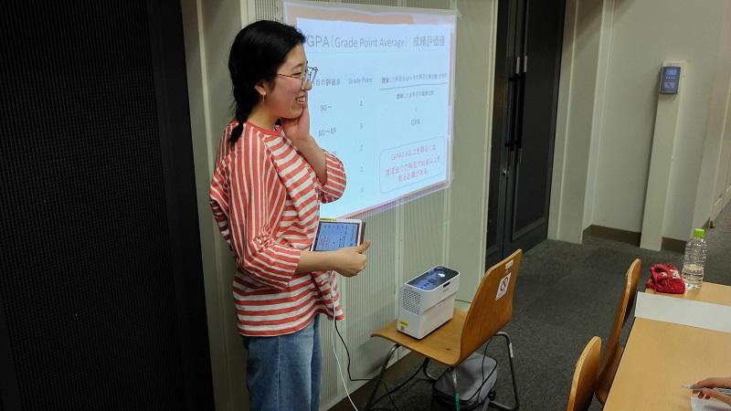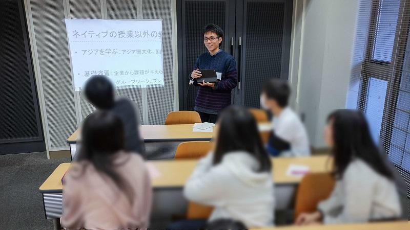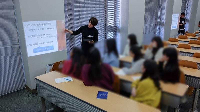学部説明に続き『フルサポートを取るにはどうしたらいい?』という課題が参加者に与えられ、各グループが課題解決に向けて取り組みます。「自分なりの英語の勉強の仕方を見つける」「積極的にGlobal Plazaを活用する」など、それぞれの意見をWebClassで集約し、高校生による全体発表を行いました。課題解決やグループワーク、ICT活用は外国語学部での学びの基本となる部分であり、外国語学部の学びのあり方を高校生に示すことができました。(代表者:柳沢秀郎)