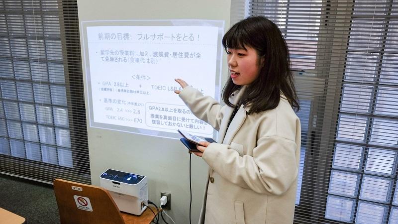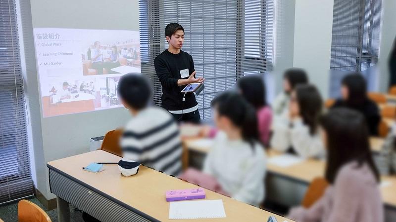 2019年1月13日に開催された推薦入学合格者のためのオリエンテーションで、外国語学部一年生の6名が学生企画発表を行いました。大学生活やAll Englishで行われる授業の様子、セメスター留学に向けてフルサポートを取得する秘訣、TOEIC対策など、自分達で作成したパワーポイントをもとに、先輩として未来の後輩へのアドバイスがなされました。