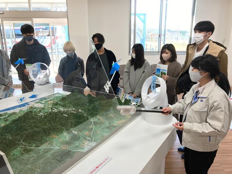株式会社青山高原ウインドファームの現地では、総務部の國分智史係長から現場案内をしてもらい、高原の風力発電所敷地内にあるモデル見学所も訪問し、約1時間、青山高原風力発電の工事着工に至るまでの経緯、風量と発電量との関係、地域雇用効果などに関する説明会も開催された。