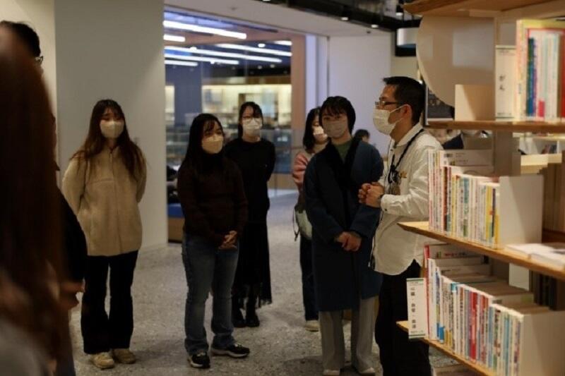 2月15日には、豊橋市まちなか図書館を見学しました。豊橋の駅前にできた新しい図書館です。11名の学生とアドバイザー、3名の教員が参加しました。佐野館長補佐さんにご案内いただきまして、興味深い見学ができました。座席数が多く、中高生もたくさん訪れています。テーマ別の排架、書籍の「面出し」展示がなされていて、どの棚にも興味をひかれます。中央には講演などが行われる階段状のホールや、カフェがあり、各種の講座や企画が盛りだくさんです。楽しい図書館のありようは、見学した学生さんたちのこれまでの図書館のイメージを大きく変えたようです。