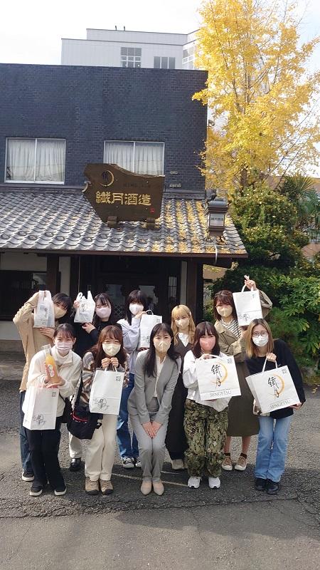 販売を前に11月19~21日には経営学部の2~4回生9名が熊本県人吉市を訪問,令和2年7月豪雨で大きな被害に遭われた明治10年創業の老舗茶舗・立山商店,同じく明治36年創業の球磨焼酎メーカー・繊月酒造などを訪問し,直接,販売する商品の一部を仕入れてきました。