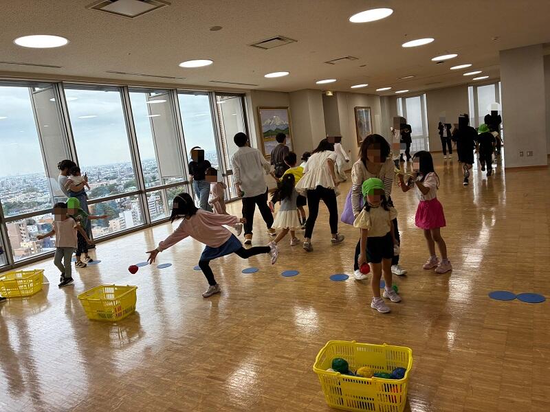 フープめがけてボールを投げ入ったらフープをゲットできる遊びや、コーンかいじゅうをボールで倒す遊びなど、今回は投げる動きをメインとした運動あそびを行いました。教室の中での運動でしたが、紙ボールを使って狭い場所でも安全に行う工夫がされており、子どもたちは夢中になって楽しんでいました。