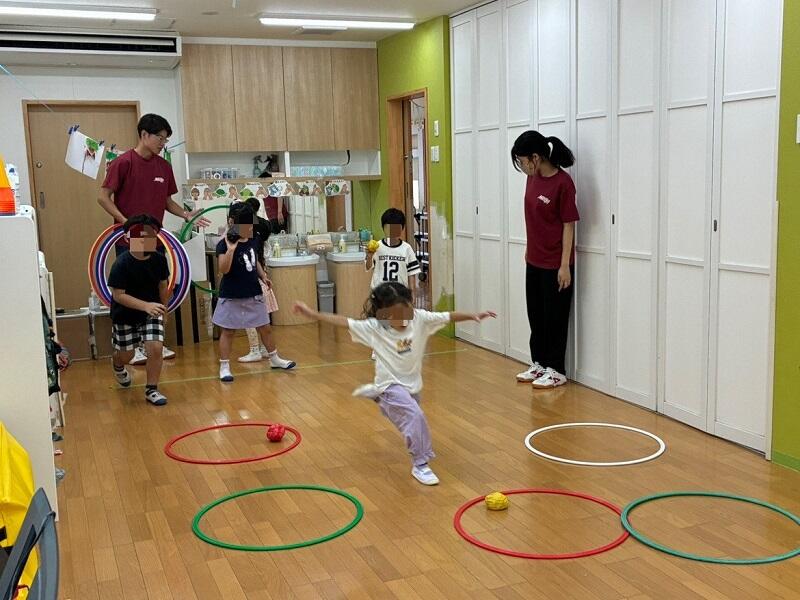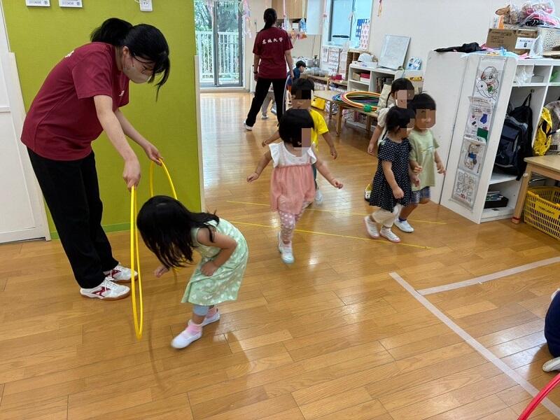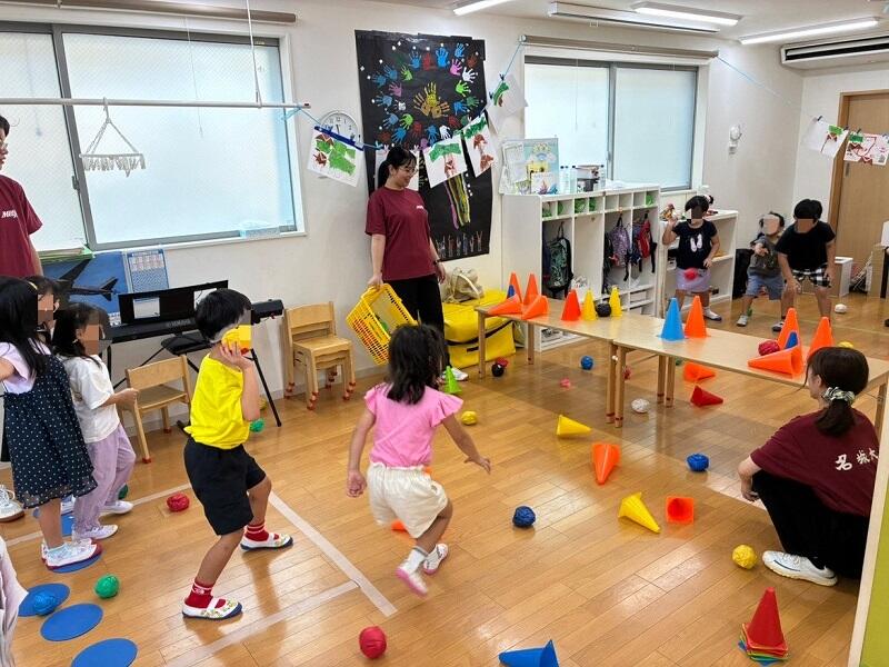 2025年9月4日(木)、ウィズブック保育園八事で2回目の運動あそびで交流会を行いました。Meijoプレイリーダーズの4人が園にうかがい、考えてきた運動あそびを園児と一緒に楽しみました。