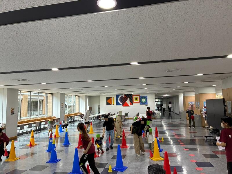 当日は前日の雨の影響により、予定していた芝生広場ではなく、屋内スポーツセンターでの実施となりました。「商店街にぎやかスポーツエリア」の一角として、スタンプラリー形式で5つのブースを回りながら、幼少期に経験してほしい多様な動きを楽しく体験できるプログラムを提供しました。