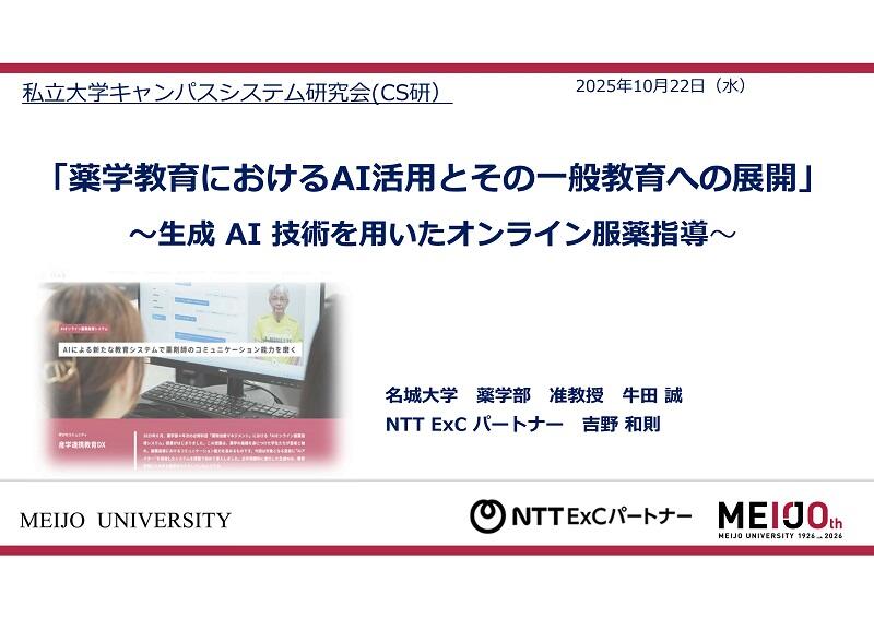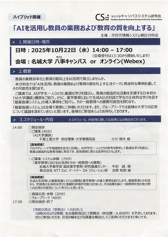 2025年10月22日(水)に名城大学八事キャンパスで、「AIを活用し教員の業務および教育の質を向上する」をテーマに私立大学キャンパス研究会が行われました。当日は、本校でのAIオンライン服薬指導学習システムを用いた教育とその効果について講演し、新たな活用法などについて他大学の教職員と協議しました。