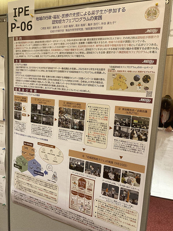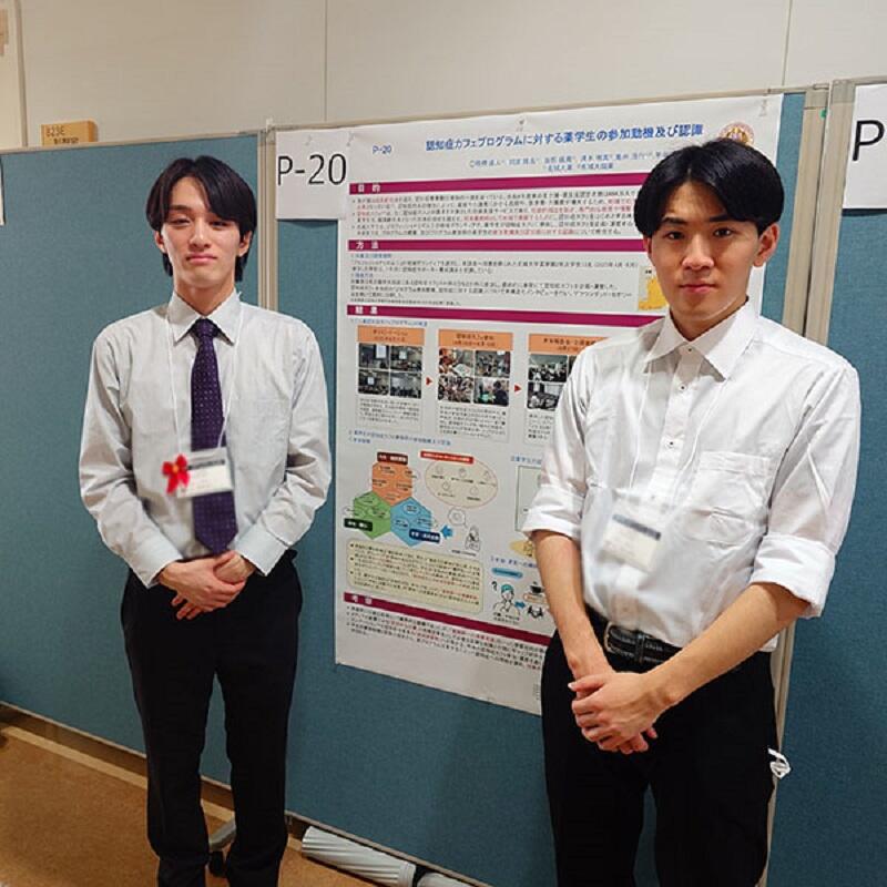 第19回日本ファーマシューティカルコミュニケーション学会(千葉県船橋市)では、本プログラムに参加した学生へのインタビュー解析をもとに、名城大学の学生がどのような動機や考えをもってボランティア活動に参加しているのかについて、籠橋遙人さん、坂部颯飛さん(病院薬学研究室・5年)が学生の立場から発表しました。学生主体の活動を客観的に振り返る内容は、多くの関心を集めました。