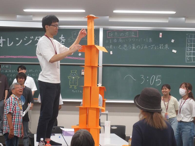 薬学生が「どんな薬が将来あるといいか?」を参加者と話し合い、そのアイディアをタワーに積み上げました。結果は…超高く! 会場は笑いと驚きに包まれました。