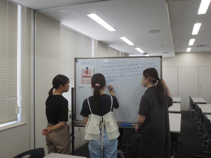 6月27日以降、天白区の洗練された認知症カフェに参加した経験をもとに、名城大学薬学部でどんな認知症カフェができるか、3つのグループに分かれて議論しています。参加したカフェの運営スタッフからの助言を生かして実現可能なカフェを考案します。今後各グループが個別に議論を繰り返し、9月20日に向けて準備を進めます。