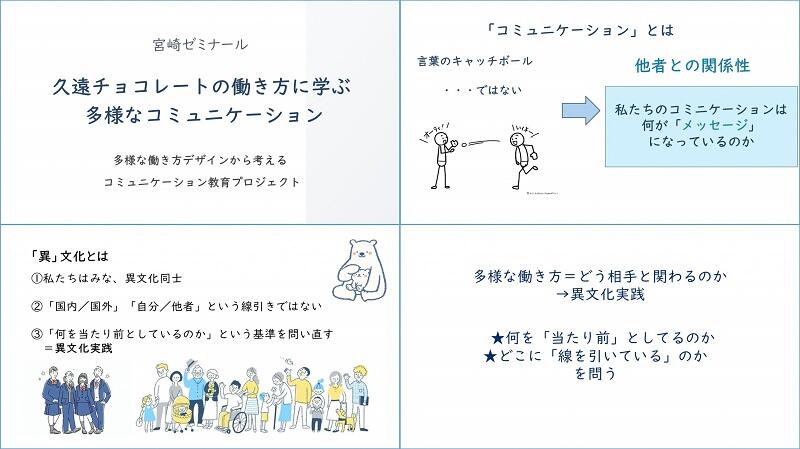 学生プレゼンでは、①コミュニケーションの定義、②異文化実践、③QUONチョコレートの職場や働き方の仕組みづくり、という三つの観点から、「デザイン」をキーワードに「多様な働き方」の可能性について発表しました(写真②、写真③)。発表を踏まえ、学生たちはこれまで課外活動で調べてきたことや著書を読んで感じたことなどを、直接夏目さんに伺いました。