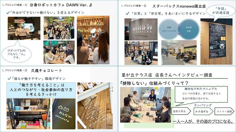 一方、DAWNカフェは店構えからも店内の様子を知らなければ利用する心理的ハードルは高いかも知れないという声も大きく聞かれました。nonowa国立店のスターバックスは独立店舗ではなく、駅ビルの一部になっています。最初はその点に驚いた学生も、なぜそのようなデザインにするのか考えを巡らせました。それは敢えて境界線をあいまいにし、障がいの有無にかかわらない、日常になじむ環境づくりをしているのではないかという気づきにつながる貴重な学びの体験となりました。