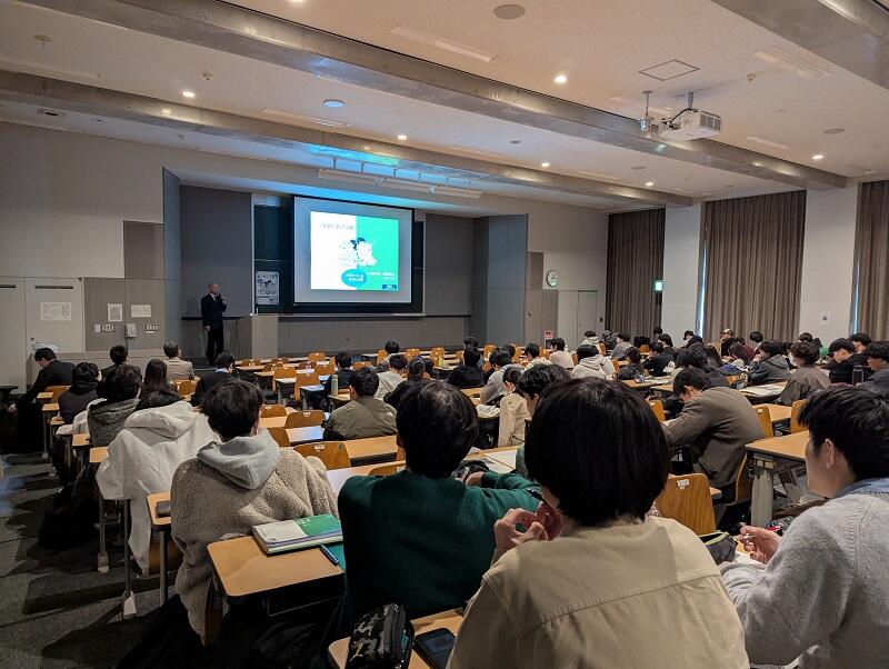 11月12日(水)13:10より、名古屋国税局総務部次長 黒田哲也氏による講演「社会における税」が行われ、集まった200人の聴衆は熱心にノートを取りながら拝聴しました。黒田氏の講演の後には、名古屋国税局に勤務される名城大学OBの大島史也氏が登壇され、「先輩からのメッセージ」と題して国税専門官を志望した理由や職場の雰囲気を語って下さいました。講演会後の座談会では質問(国の財政や税に関すること、仕事の内容や働き方についてなど)に丁寧にお応えくださり、参加した学生たちは充実した良い時間を持つことができました。