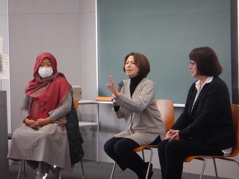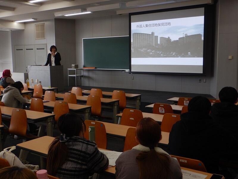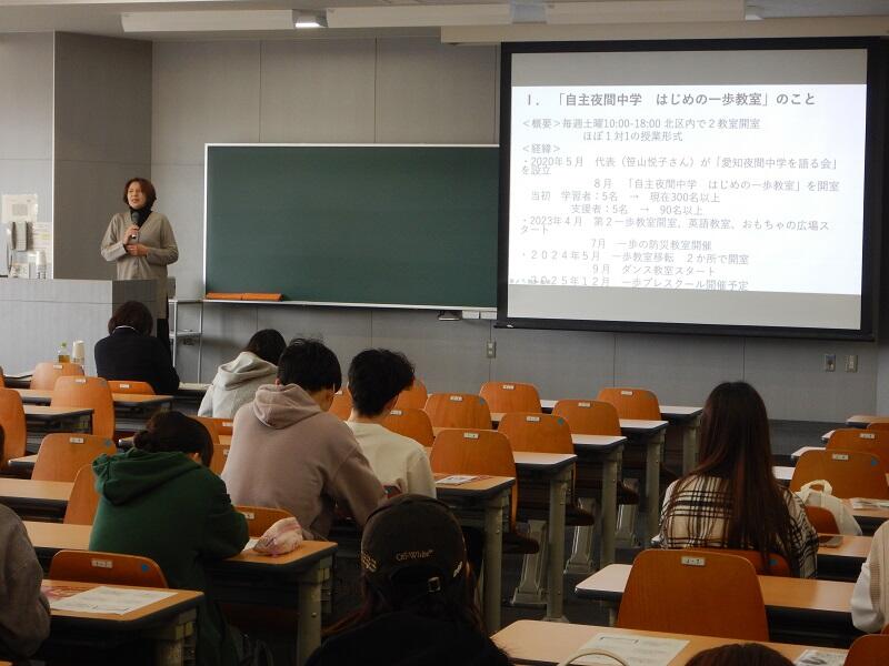 愛知県は全国でも外国籍住民の割合が非常に高いにもかかわらず、生活支援体制は十分とはいえず、共生社会の実現には依然として多くの課題がある。そこで、地域の日本語教室という異文化交流の場を入り口に現実を知り、日本社会の課題として学生とともに考える機会を設けた。講師には、県内で共生社会づくりに取り組む重原厚子氏(NPO法人愛知夜間中学を語る会)、マリアム戸谷玲子氏(日本語教室主宰)、伊東浄江氏(NPO法人トルシーダ)を迎えた。参加学生は他学部を含め約50名で、アンケート回答者44名のうち8割以上が「日本語教育や多様性への理解が深まった」と回答した。講義では、夜間中学の取り組み、イスラム教のハラール子ども食堂や女性就労支援、外国にルーツを持つ子どもが多く暮らす保見団地の実践などが紹介され、学生の理解を後押しした。「ボランティアに参加したくなった」「寄り添う姿勢に感銘を受けた」といった声も寄せられ、外国人をめぐる課題が語られる今日、一人の人間として向き合う重要性を再認識する機会となった。