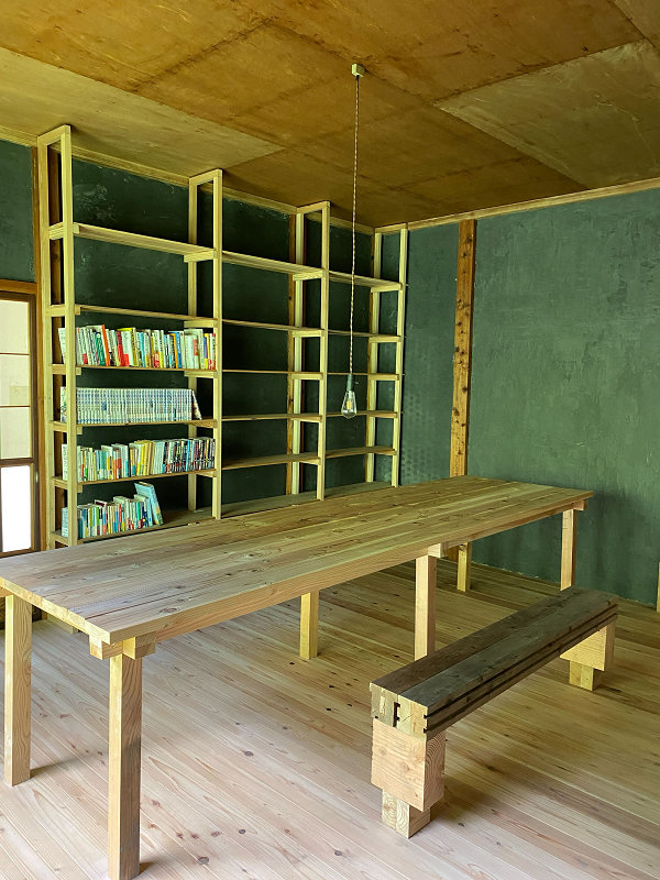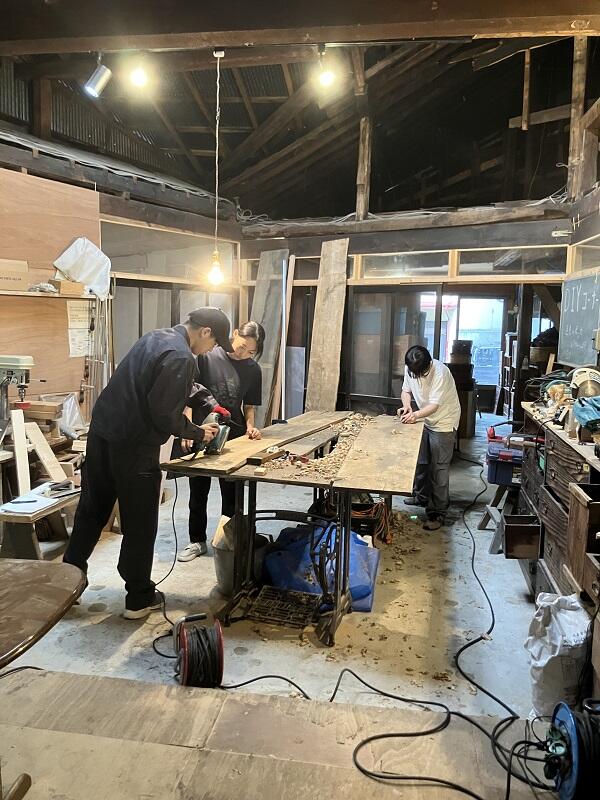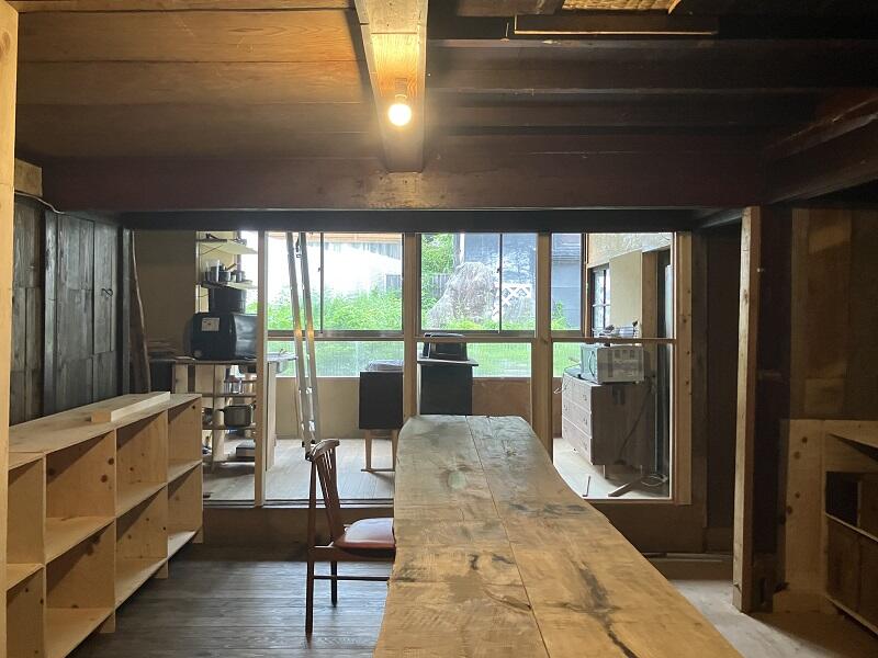1つは長野県塩尻市の木曽平沢重要伝統的建造物群保存地区にて、1室の改修作業を行いました。ここでは、古材や古道具を活用して空間を作るプロジェクト。工房にて工具の使い方を覚えてから作業開始です。大きな机の空間は古材や古道具の味わいを生かしたデザインとなりました。