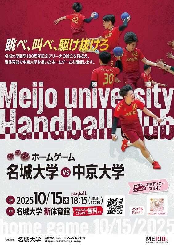 10月15日、MSP(MEIJO SPORTS PROJECT)が中心となり、本学と中京大学によるハンドボール部のホームゲームを天白キャンパス新体育館で開催しました。約230名が来場し、企画から当日の運営までを学生が担う、本学として初の学生主催ホームゲームとして実施しました。