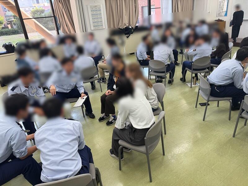 会議室に戻ってから、今度は学生が5~6名ずつのグループに分かれ、各グループに職員さんがついてくださって、「対話」形式で質疑応答をしていただきました。少人数で質問しやすい雰囲気もあってか、どのグループも活発に話し合いが行われていました。