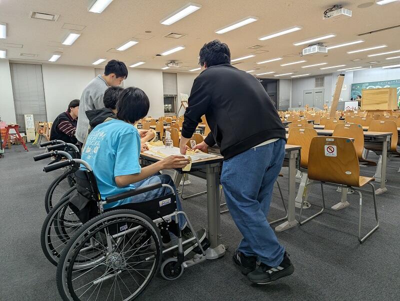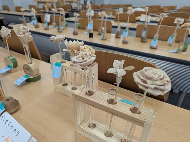 10月31日(金)及び11月1日(土)に行われた大学祭に参加しました。「企画」は、愛知大学野球リーグのバットや工場の廃棄パレットを材料にした作品の販売と、おもちゃや花を作るワークショップです。今年も収益は能登半島の被災地への寄付とさせて頂くことが決まっており、会場でポスターなどでお知らせし、来場された皆様にもご案内をしました。一般の方のご来場も多くあり、学生の説明を熱心に聞いて下さってご購入や募金を頂きました。皆様から頂いたご寄付は12月に中部善意銀行に持参する予定です。