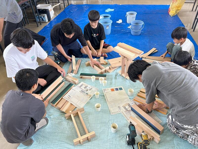 参加者は、自分たちが選んだ色の組み合わせで木材を自由に彩色し、その後、協力して椅子の組み立てを行いました。子どもたちは工具を使い、目を輝かせながら作業に没頭していました。