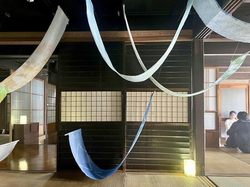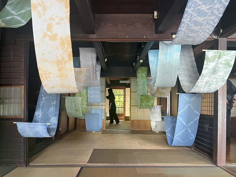 完成した布は、旧竹屋の空間に展示するためのインスタレーション作品として使用されます。子どもたちは、絞りの形によって生まれる模様の違いに驚きや喜びの声をあげ、夢中になって布を染め上げていました。