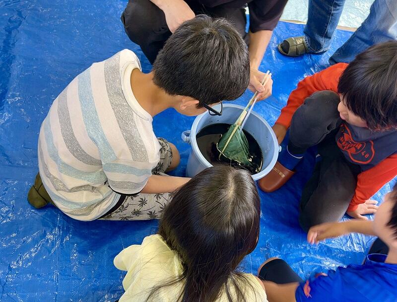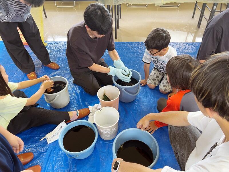 木綿の白い布に、子どもたちが思い思いの絞り(タイダイ染め)を施し、色付けを行いました。