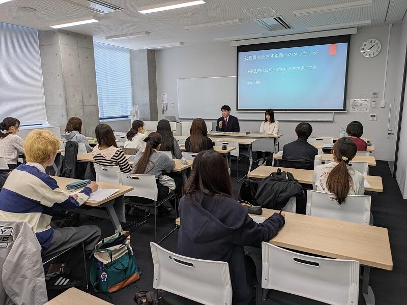11月6日、公務員として活躍している卒業生お2人をゲストとしてお招きし、公務員をめざす在学生との座談会を開催しました。
