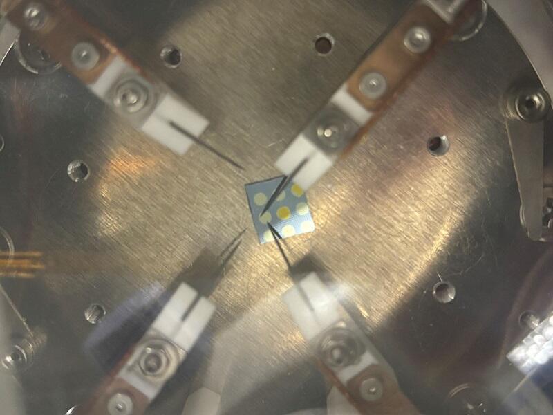 これまでミスト化学気相成長法とスパッタリング法を用いて酸化物半導体薄膜の合成を行ってきました。今回は、ミスト化学気相成長法を用いた酸化物半導体の合成条件(写真①)を、機械学習を用いて最適化することにチャレンジしました。具体的には、高い結晶配向性が得られる合成条件を、合成温度と前駆体濃度で最適化できるよう、python上でベイズ最適化のプログラムを組んでみました。合成実験からは、特に成膜温度によって結晶構造が如実に変化することを確認でき、ベイズ最適化を用いることで実験条件を最適化出来る可能性が示されました。また、実際に薄膜トランジスタ構造を作製し、トランジスタのスイッチング特性の評価を行いました(写真②)。