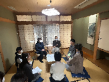 名城大学の薬学(5名)、名古屋大学の医学(3名)、看護学(8名)や理学療法学(1名)、および日本福祉大学の社会福祉学(3名)の専攻科生が3グループに分かれて実施しました[全20名参加:11月17日(月)]。高齢化社会の介護医療・地域医療をテーマとして、「患者を生活者として理解した上で、患者や家族の医療ニーズを理解することができる療養計画を立案する」ために 5学科の学生(医・薬・看・理学療法・社会福祉)がチームを組み、グループワーク(GW)を行いました。すなわち、シナリオを元に症例検討した後、ウェアラブルカメラ装置を装着した1つのグループが模擬患者・家族が待つ和室へ移動し、他の2グループはウェアラブルカメラ装置を装着せず、患者・家族中心の在宅訪問診療を模擬体験しました。