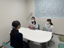 ②④でのグループワーク(写真2)や③での模擬患者家族への医療面接(写真3)においては隣室のブリーフィングルームに設置されているモニターと音声から学生の様子、活発に討論がされているかを医・看護・歯科衛生の学部教員と観察しました。