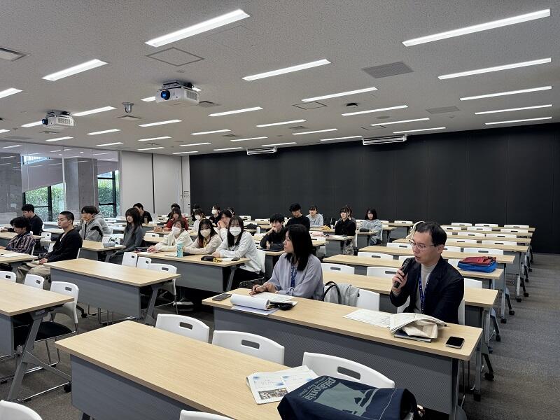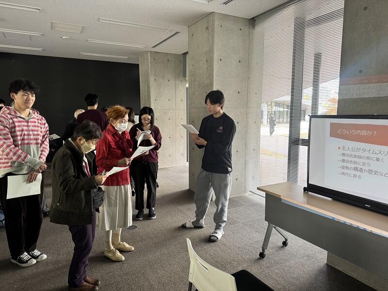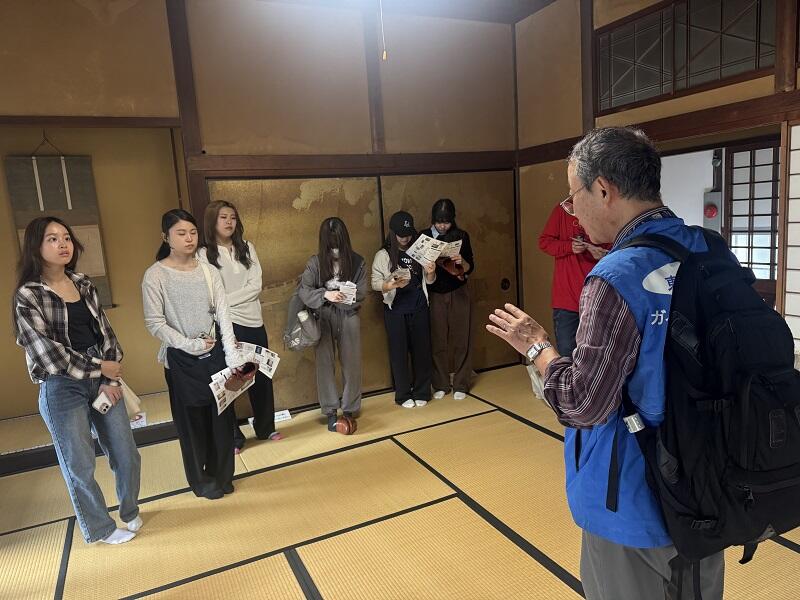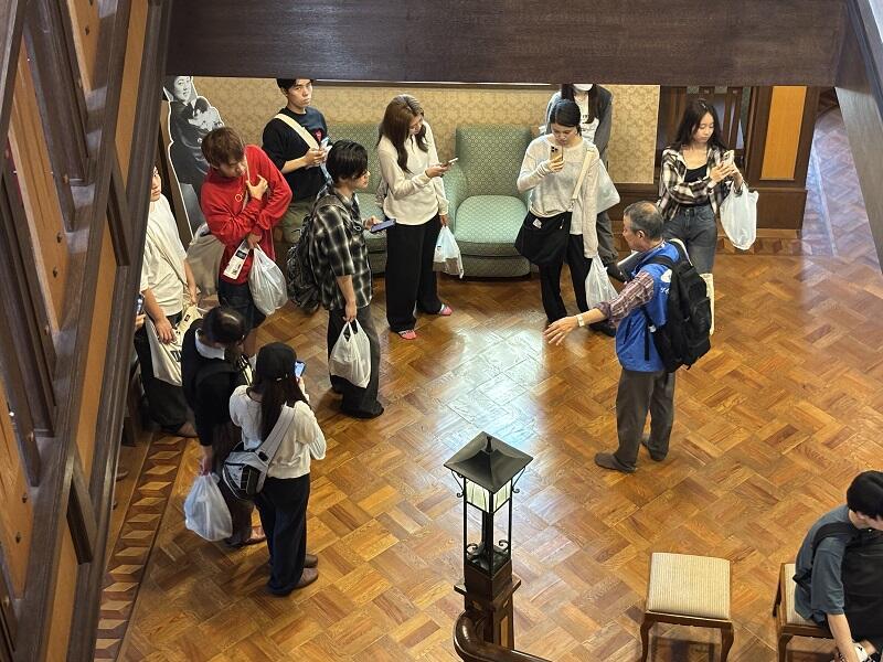 外国語学部1年次の2つの基礎演習クラス(西尾ゼミ、増田ゼミ)が合同で、名古屋市歴史まちづくり推進室および東区と連携してICTを活用した地域情報の収集及び発信力向上プロジェクトに実践的に取り組み、その一環としてフィールドワークを実施しました。事前に名古屋市東区企画経理室の杉氏には講師としてご参加いただき、文化のみち地区の歴史的背景や現存する文化的遺産や建造物等について講義を受けました。今回は、文化のみちの認知度を上げるための方策について20代・30代の若者、30代・40代のファミリー層を対象に、YouTubeなどの映像を作成することという課題が与えられました。提案のための情報収集と取材のため、約26名の受講生がフィールドワークに参加し、まず東区文化のみちエリアにて東区文化のみちガイドボランティアの会の協力を得てガイド担当者から英語も交えた詳細な説明を受けながら、各チームで説明の記録を取るなど情報収集を行いました。