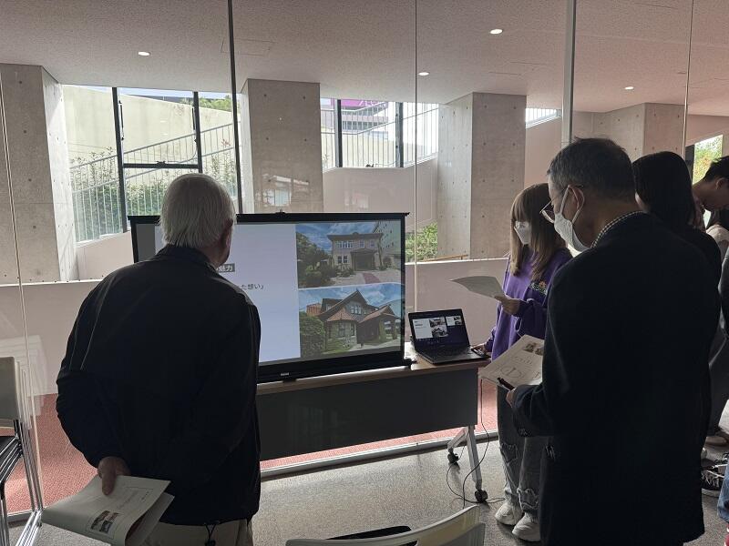 ICTを活用した文化のみち認知度向上プロジェクトの最終イベントとして、東区役所の担当者、文化のみちガイドボランティアのメンバーの皆様を招いてポスター発表を開催しました。教室の6カ所に映し出された映像の前でチーム全員が参加してそれぞれの提案内容について詳細な説明を行いました。発表を聴いた地域の参加者や学生からは次々と質問が投げかけられ、それに対して発表者が丁寧に説明するなど、双方向のやりとりが活発になされたました。最後に地域担当者、ボランティアガイドのみなさんから発表に対して全体的な講評がなされたが、いずれの発表も最新のICTを活用した映像でよかった点が強調されていました。
