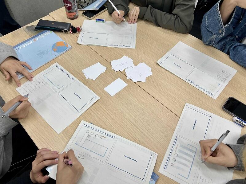 活動当初は「グローバル化」という枠組みに引っ張られる表現が多く見られましたが、回を重ねるごとに、より突飛なアイデアも可能性を広げることに気づくようになりました。たとえば、「推し」というキーワードをさまざまなものと組み合わせることで、「好きなことなら続けられる」という視点が生まれ、「推し活×勉強」というテーマに辿り着いたグループもありました。