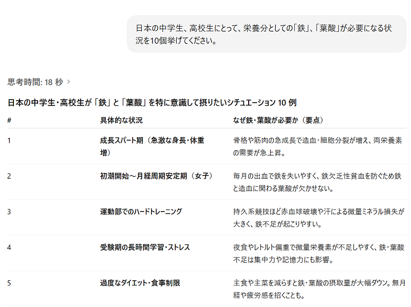 まず、ヤクルト様の商品価値を深く理解するため、AIを用いて「中高生に鉄・葉酸が必要となる具体的なケース」を多角的に調査。成長スパート期、初潮、運動部での激しい練習など、健康情報を短時間で整理できたことにより、学生たちは「自分たちが扱うテーマの背景」をまず掴む姿勢を身につけることができました。