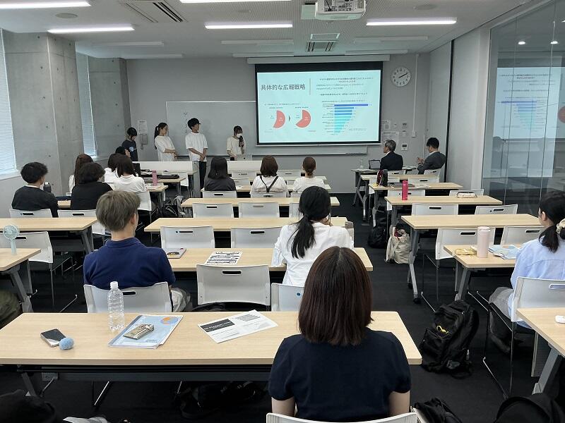 槌屋様からは人材確保のための施策を考案する課題が出されました。これを受け、学生たちはイベントやパンフレットを提案すべく、キャッチフレーズの作成やプレゼンにイラストや動画を取り入れるなど、AIやICTを駆使し、協働の成果を発表しました。