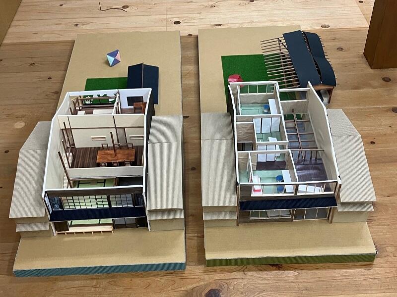 1階では模型を用いた空家活用の提案、2階ではPPTによるこの提案についてのレクチャーを行った。