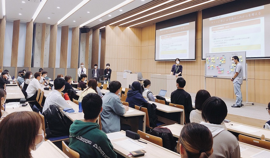 学部の学びの入口に立つ1年生が、さまざまなセクターや職業からまちづくりに関わる人の職能(思い、志、きっかけ、経緯、知識、スキルなど)を知り、ロールモデルを見つけることで、大学4年間の学びや将来像を考える講義です。ゲストトークを行う回では、上級生のサポートも受けながら学生同士で感想や質問をシェアし、ゲスト・教員・学生のディスカッションを通して学びを深めていきます。「どのような学生時代だった?」「何か始めたいけど不安な時は?」「挫折をどのように乗り越える?」など、学生の生の声から展開されるディスカッションを通して、各々が次の一歩を踏み出すきっかけを持ち帰ってほしいと考えています。