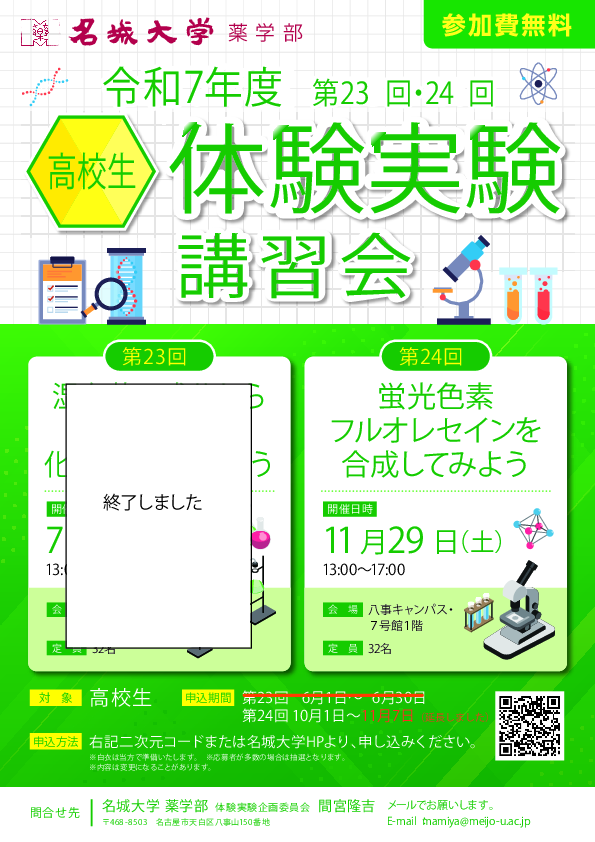 名城大学薬学部 体験実験企画委員会 間宮隆吉 mamiya@meijo-u.ac.jp |