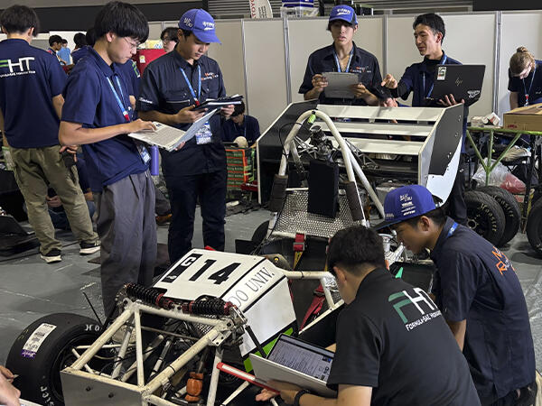 「静的審査」には、デザイン、コスト、プレゼンテーションの3つの要素、「動的審査」にはアクセラレーション(加速走行)、スキッドパッド(旋回性能)、オートクロス(1周のタイムアタック)、エンデュアランス(20周の耐久走行)の4つの要素があり、総合点で順位が確定します。車両の完成度だけでなく、設計思考やチームの運営力なども評価の対象となるため、チームの一体感も重要で、学生のうちから自動車開発のプロジェクトチームに参加したような経験を得ることができます。