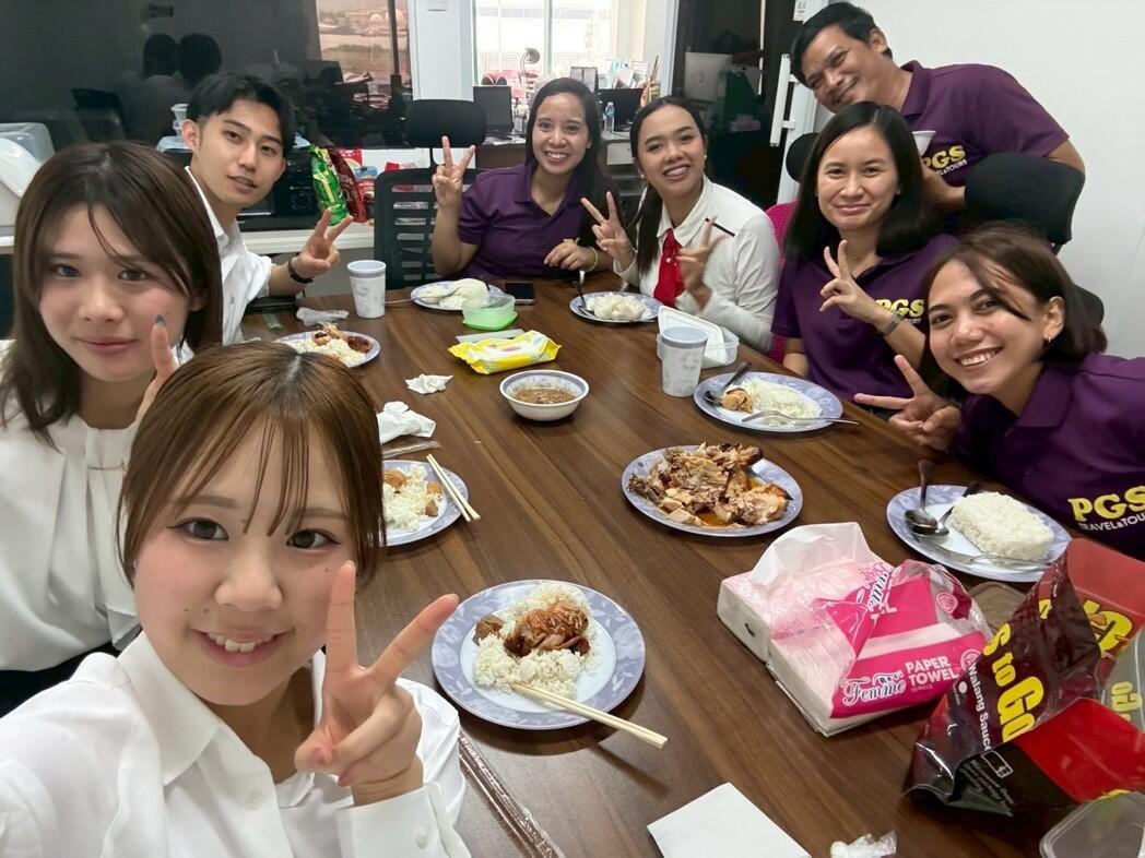インターンシップ最終日。私たちのために、従業員の皆さんがケーキとセブ島名物の鶏料理を用意してくれました