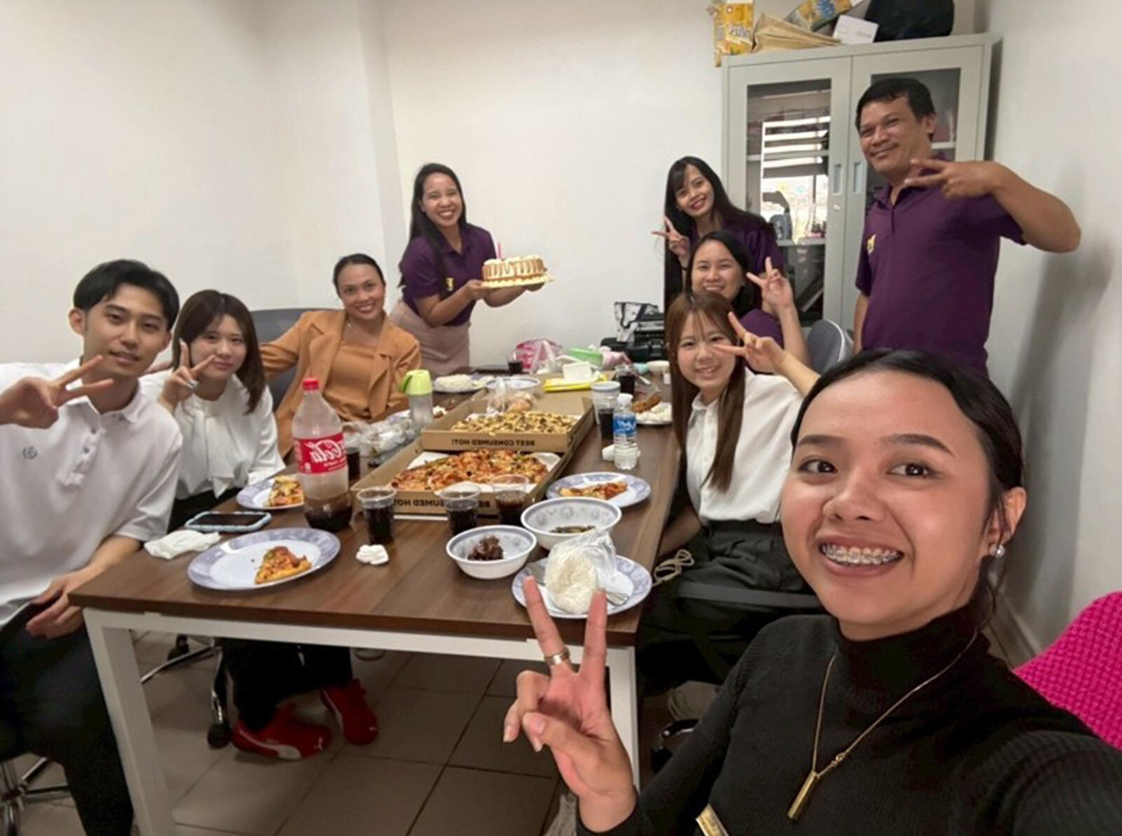毎日スナックタイム(休憩時間)があり、 この日はピザを食べながら誕生日の方のお祝いをしました