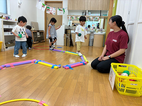 運動あそびの進行においては、説明を最小限に抑え、子どもたちが実際に体を動かす時間を多く確保することを意識しました。子どもたちの発達状況に応じて、バランスをとる動きや、ジャンプ、投げる動きなど、さまざまな動きを取り入れた楽しいプログラムを展開しました。