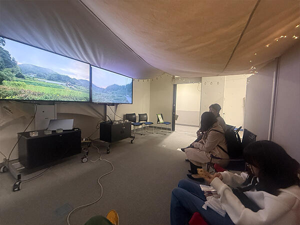 展示ブースでは、山添村を感じてもらう没入型の空間を演出。部屋の中を村の名産であるお茶の香りで満たし、テントや照明で雰囲気を整えながら、山添村の美しい風景を映した映像を2台の大型ディスプレイに投影しました。さらに、大学の機器を活用して制作したオリジナルキーホルダーや、村の名所を絵柄に用いたおみくじなども配布し、様々な面から村の魅力を伝えました。