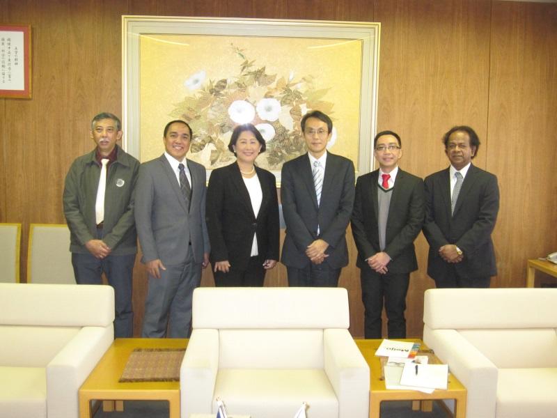 記念撮影(左からOreta教授、Dungca工学部長、Gaspillo科学技術キャンパス担当副学長、福島副学長、Cruz広報室長、クマーラ新学部開設準備室長)