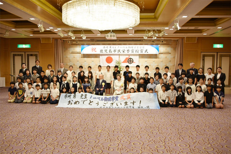 赤﨑終身教授の出生地である南九州市(旧知覧町)の名誉市民称号授与式が、11時から鹿児島市内の城山観光ホテルで行われ、霧出勘平南九州市長から賞状と青色LEDにちなんだ青色リボンのメダル、県川辺仏壇協同組合の10人の職人が手作りした赤﨑家の家紋入りの「神輿(みこし)」が贈られました。霧出市長は「市民に大きな希望を与えてくれました。第二の赤﨑先生が南九州市から出ることを期待しています」とあいさつ。赤﨑終身教授は「御地(南九州市)に生を受けたことを非常にうれしく思います」と感謝の念を述べました。式典後、陵子夫人とともに贈られた「神輿」に見入り、その大きさ、出来栄えに「感激にたえない」と何度も口にしました。